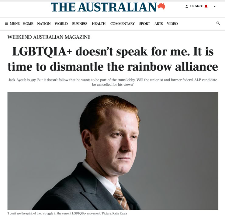Above: In “The Australian”, 28 Feb 2025. “Jack Ayoub is gay. But it doesn’t follow that he wants to be part of the trans lobby. Will the unionist and former federal ALP candidate be cancelled for his views?”