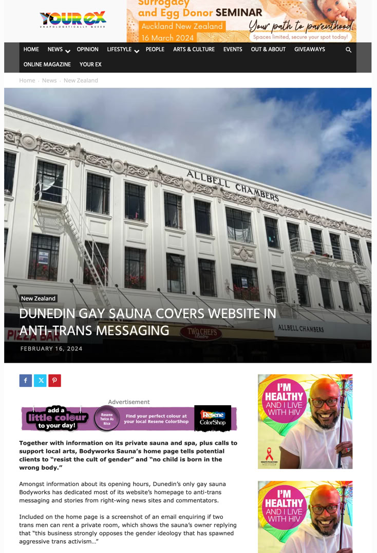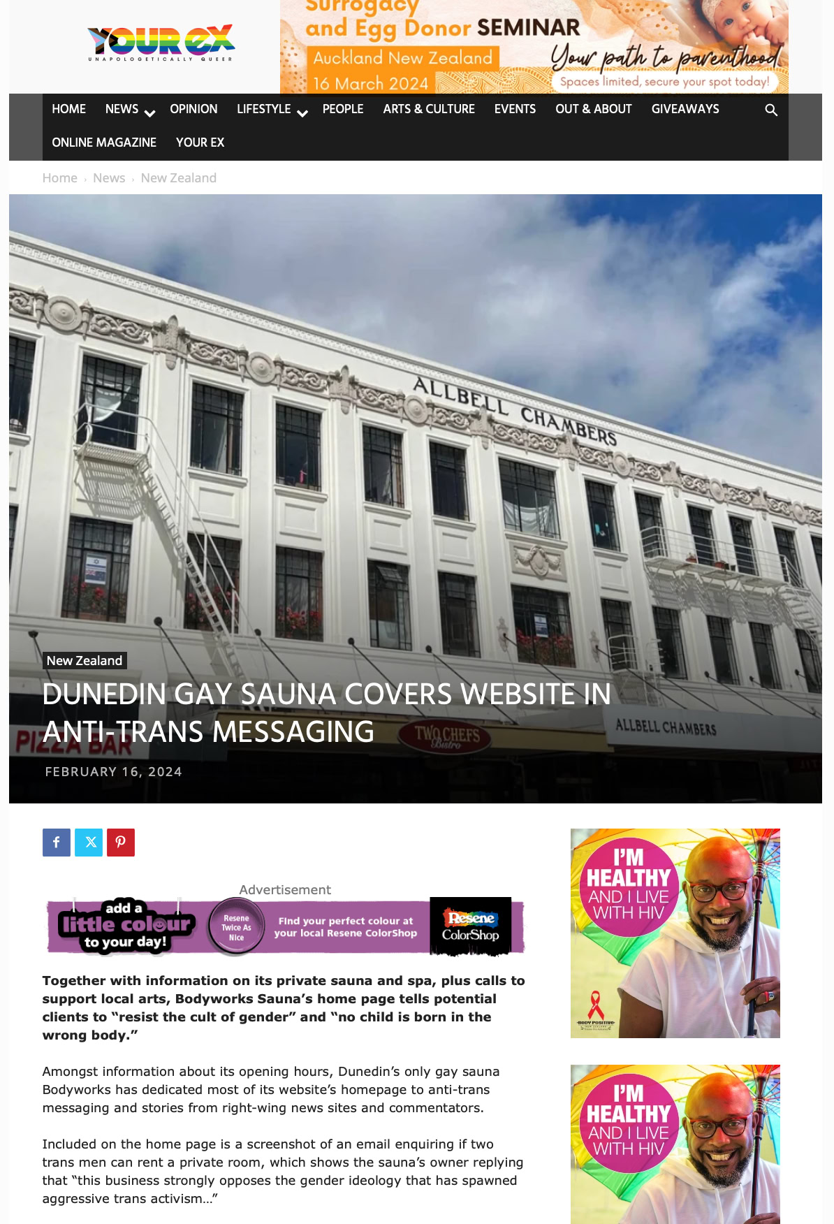 19/2/24. TRANS CULTISTS in Dunedin have recruited the national Rainbow cult magazine “YourEx” to force its agenda on us. Read the communication lower on this page.