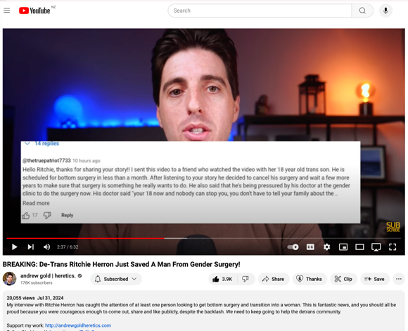 Above: Andrew Gold on YouTube: Woke Doctors TRICKED Me Into Gender Surgery - Ritchie Herron (4K) | heretics. 25 July 2024.