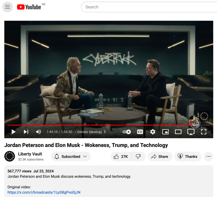 Above: Conversation between Jordan Peterson and Elon Musk on YouTube’sLiberty Vault, 23 July 2024.
