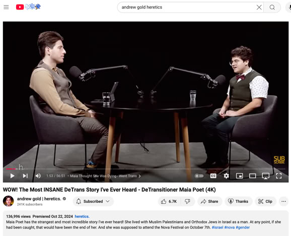 Above Left top: 22 Oct 2024. “WOW! The Most INSANE DeTrans Story I've Ever Heard - DeTransitioner Maia Poet”